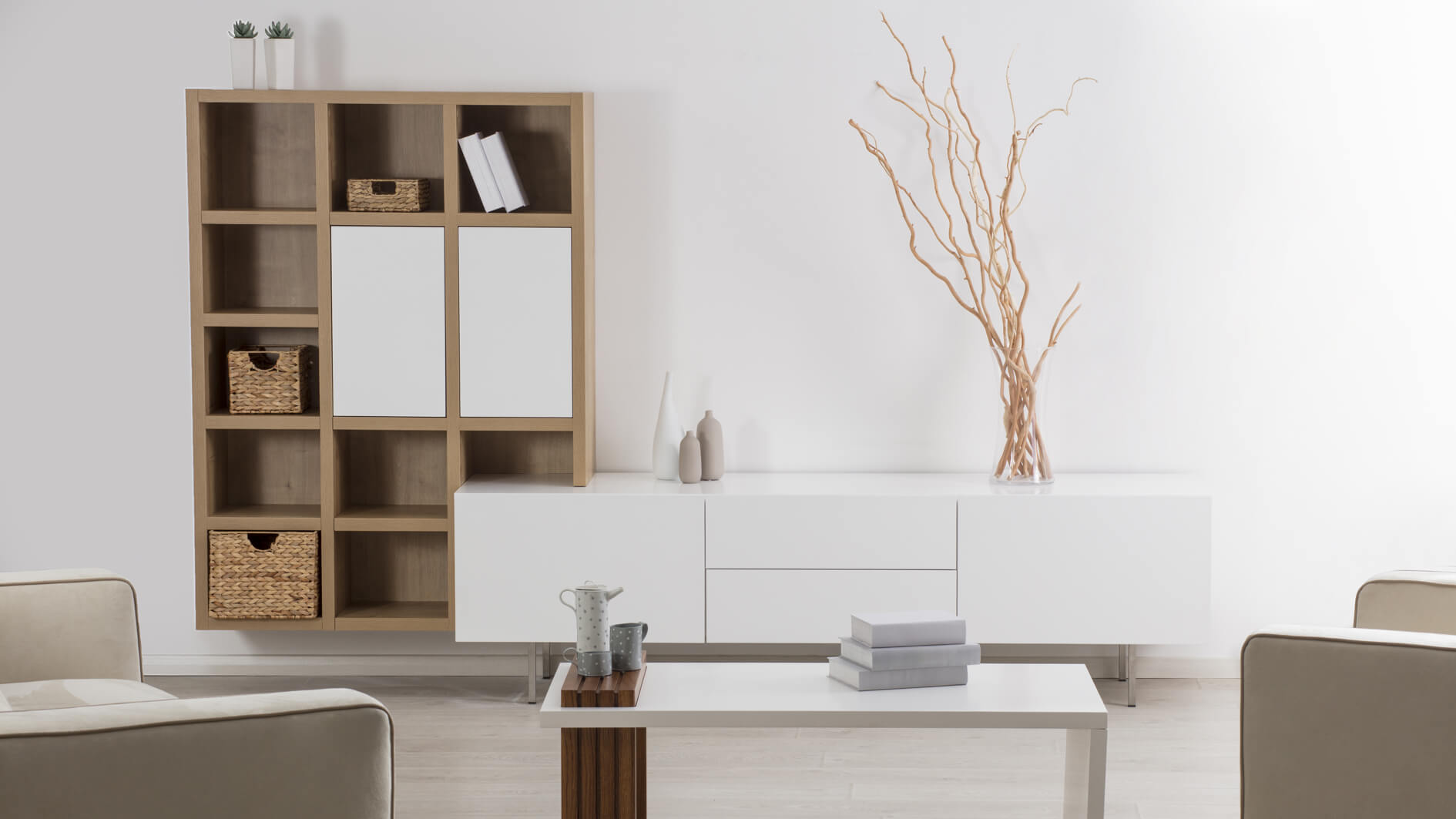 Struktura na komodi je iz belega melaminskega iverala, fronte so iz melaminskega MDF s finišem v belem laku s 50% sijajem. Komoda ima noge iz nerjavečega jekla. Konstrukcija na polici, ki je nameščena na steno, je izdelana iz melaminskega iverala v tonu zlatega hrasta. Fronte na zaprtih policah so izdelane iz melaminskega MDF laka v beli barvi s 50% sijajem.